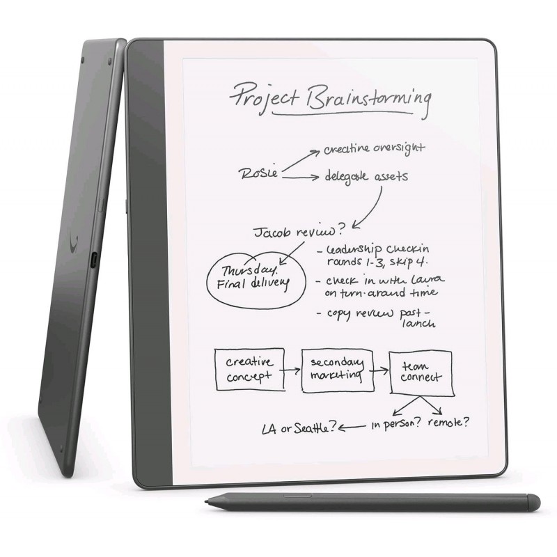Obsahuje Kindle Scribe s podporou wifi, prémiové pero, nabíjecí kabel USB-C, 5 náhradních hrotů, nástroj pro výměnu hrotu a vestavěnou dobíjecí baterii.