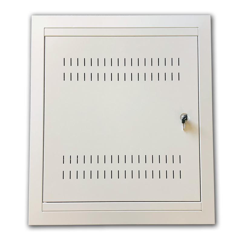 Datacom 19" rozvaděč pod omítku 4U+2U/150mm (plech) Nástěnná rozvaděčová datová skříň 4U vodorovně + 2U svisle je vyráběna pouze v jedné rozměrové variantě o rozměrech: vnější výška s rámem (bez rámu): 770 mm (670 mm) vnější šířka s rámem (bez rámu): 670 mm (570 mm) vnější hloubka s rámem (bez rámu): 150 mm (150 mm) Polohovatelné uchycení lišt: - Vertikální lišta 4U (pro umístění komponent ve vodorovné poloze): 110 mm od vertikální lišty 4U k zadní stěně rozvaděče, vertikální lišty lze přemístit kdekoliv v celé výšce rozvaděče. - Horizontální lišta 2U (pro umístění komponent ve svislé poloze): 350 mm (+-80mm) od horizontální lišty 2U ke dnu rozvaděče!!! Změna polohy horizontální lišty 2U je možná pouze před zaomítáním rozvaděče !!! - Tato datová skříň je určena jako rozvaděč pro instalaci prvků strukturovaných kabeláží a prvků telekomunikačních rozvodů. Vlastnosti: - vlastní odvětrávací otvory ve dveřích rozvaděče- skříň tvořena svařovaným skeletem, polohovatelné pozice vertikálních lišt Upozornění: svisle umístěné vertikální lišty 2U lze polohovat pouze před zabudováním rozvaděče- z čelní strany je rozvaděč osazen plechovými perforovanými dveřmi se dvěma panty- lehce nastavitelné levé/pravé otevírání- kovový zámek na klíč s jednobodovým zamykáním- v zadní části jsou 4 otvory pro případné uchycení na v SDK stěně /rozteč 10mm otvorů - 58,5mm x 400mm/- horní a spodní vylamovací průchody pro kabeláž /260x50mm/- před instalací do zdi možno odmontovat záda rozvaděče (rozměr odnímatelných zad 610x500mm), získáte tím větší hloubku pro instalaci. - IP krytí: IP20- povrchová úprava je provedena práškovou technologií- barva šedá