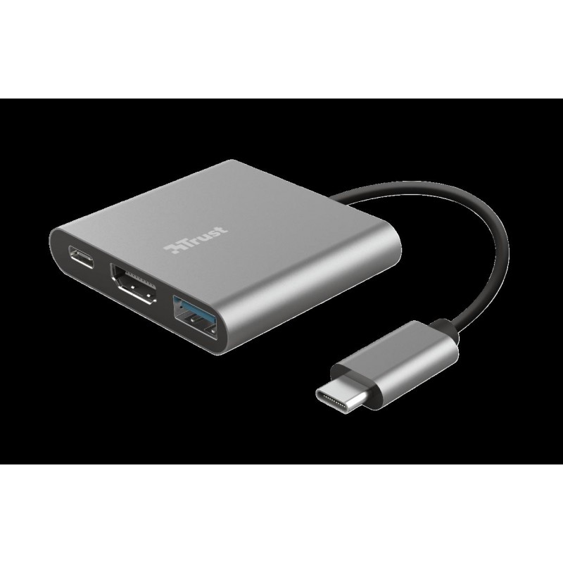 TRUST Dalyx 3-in-1 Multiport USB-C Adapter. Stylový hliníkový 3portový adaptér USB-C z hliníku pro přidání portů USB a HDMI a nabíjecího portu typu C do notebooku.