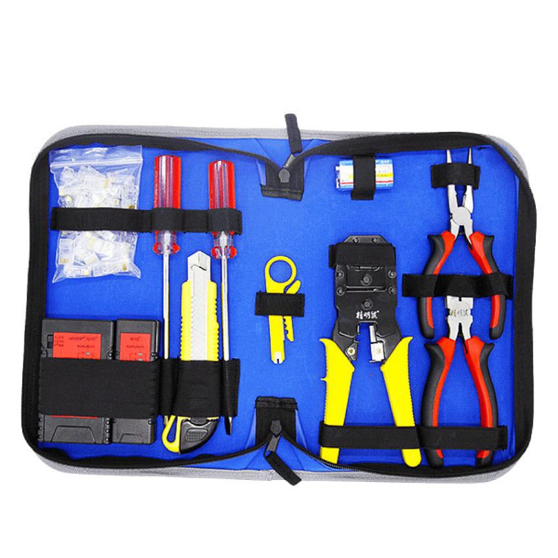 11 dílná sada nářadí pro síťaře obsahuje: tester kabelu rj45 a RJ11, krimpovací kleště RJ45, RJ12, RJ11, 6" boční štípací kleště, narážeč, 6" půlkulaté kleště s odstarňovačem izolace, koncovky RJ 45, 2x kšroubovák, nůž a další příslušenství včetně pouzdra.