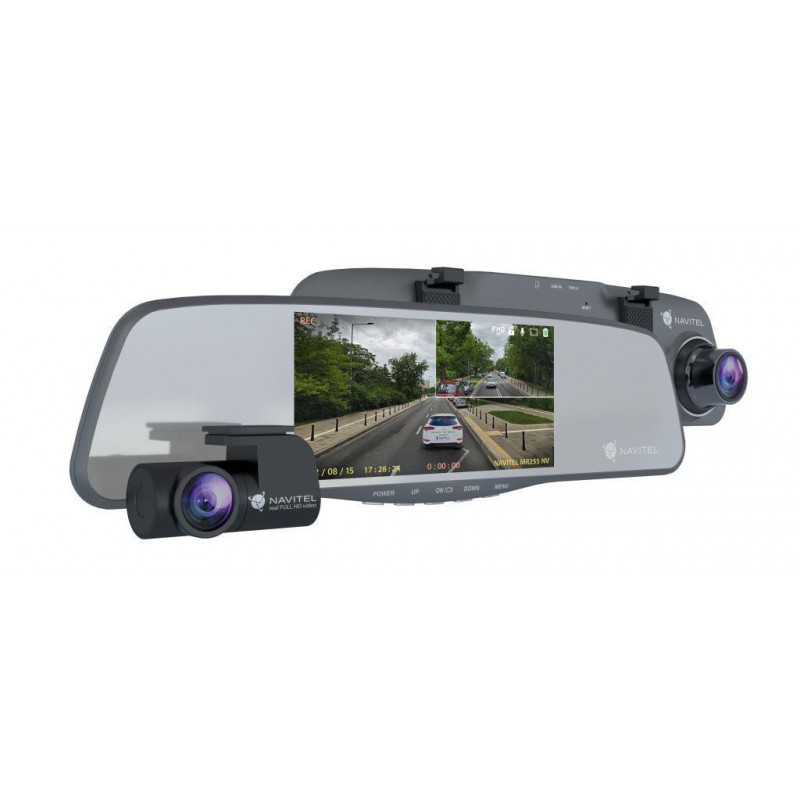 NAVITEL MR255 Night Vision je inteligentní zpětné zrcátko s vestavěným DVR, 5” displejem a přídavnou zadní kamerou. Zařízení podporuje dvoukanálový Full HD záznam a microSD karty s kapacitou až 256 GB. Kamera také umožňuje prohlížení nahraných souborů na vestavěné obrazovce. Gumové úchyty umožňují snadnou montáž kamery přes standardní zpětné zrcátko, díky čemuž je zařízení zvenčí téměř neviditelné.