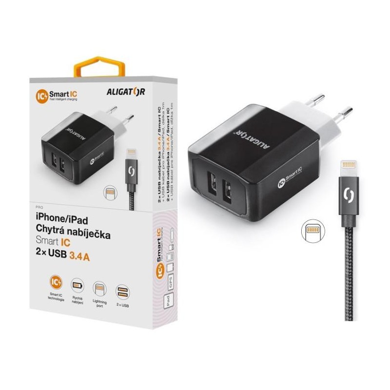 Chytrá síťová nabíječka ALIGATOR 3.4A, 2xUSB, smart IC, černá, kabel pro iPhone/iPad 2A