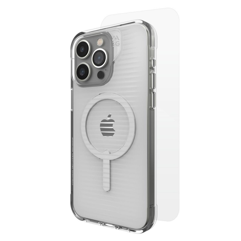 Set ochranného krytu kompatibilního s MagSafe a ochranného skla. Vyroben z 95 % recyklovaných materiálů. Pro maximální odolnost byl zesílen grafenem, jedním z nejpevnějších známých materiálů na Zemi. Zařízení ochrání při pádech z výšky až 3 metrů.