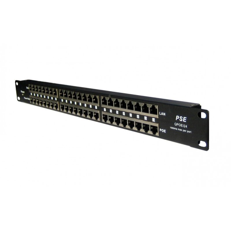 Panel integrující 24 pasivních POE injektorů, vhodný pro napájení až dvaačtyřiceti zařízení, v provedení do 19" racku.