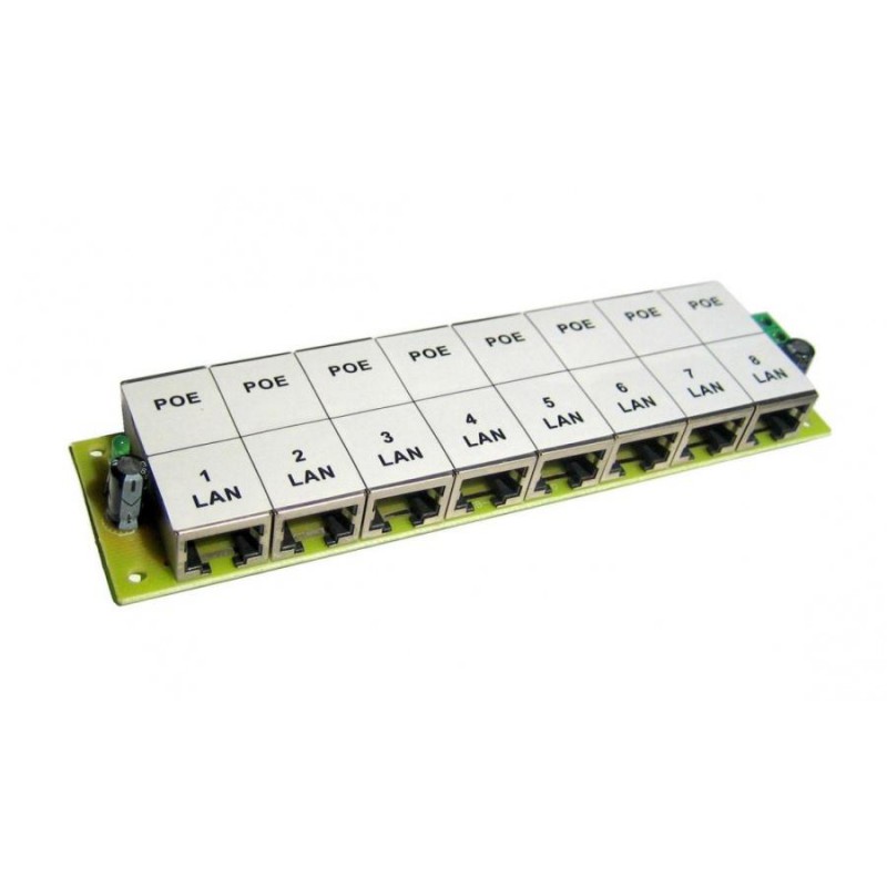 Panel integrující 8 pasivních POE injektorů vhodný pro napájení až osmi zařízení. Univerzální řešení pro vzdálené napájení většího počtu aktivních prvků s integrovaným extraktorem po UTP kabeláži.