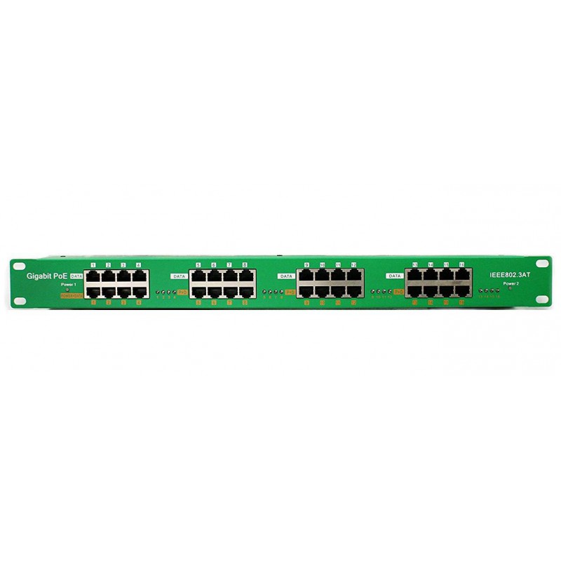 Panel integrující šestnáct gigabitových stíněných aktivních POE injektorů s napájecím rozsahem 48V (802.3af) - 57V (802.3at).