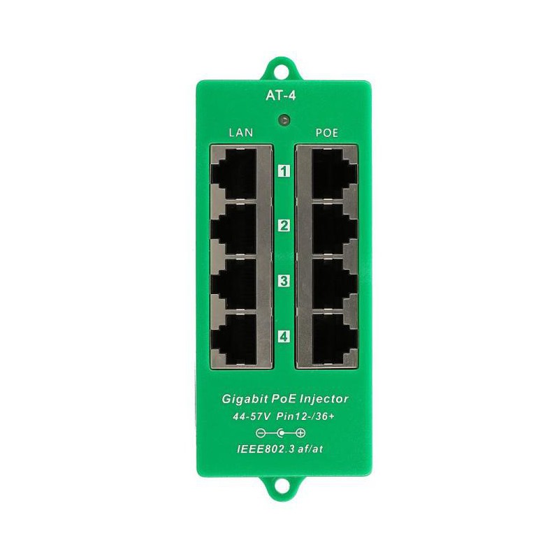 Panel integrující čtyři gigabitové POE injektory s napájecím rozsahem 44-57V a max. výkonem až 25W/port s podporou standardu 802.3af/at.