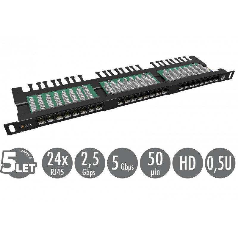 Patch panely Solarix s označením SX24HD-5E-UTP-BK jsou vysokohustotní 19" patch panely s výškou 0,5U, které jsou osazeny 24 porty RJ45 a duální IDC svorkovnicí 110/Krone. U těchto panelů je důraz kladen na maximální úsporu místa v rozvaděči, kdy do výšky 1U lze jednoduše nainstalovat až 48 portů. Tyto high-density panely Solarix jsou dostupné ve stíněném i nestíněném provedení a bez problémů splňují požadavky definované v mezinárodních standardech ANSI/TIA 568, ISO/IEC 11801 a EN 50173 včetně všech nejnovějších dodatků pro kategorii 5E a třídu vedení Class D. Panely jsou navrhnuty tak, aby byly robustní, spolehlivé, poskytovaly maximální výkon a umožňovaly jednoduchou instalaci. Součástí těla těchto panelů je vyvazovací lišta, která umožňuje pevné uchycení a přehledné uspořádání datového kabelu. Barva nestíněného high-density patch panelu Solarix je černá.