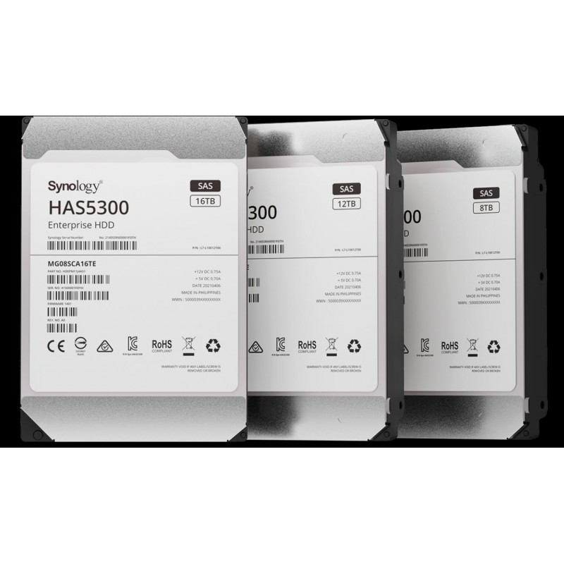 Disk Synology HAS5300 je navržen tak, aby splňoval požadavky na kapacitu, efektivitu a spolehlivost v moderních podnikových nasazeních. Je vyroben, aby zvládal pracovní zátěže až 550 TB za rok, takže umožňuje hostitelském systému obsluhovat rozsáhlé fondy souběžně pracujících klientů. Díky hodnotě MTTF dimenzované na 2,5 milionu hodin a pětileté omezené záruce společnosti Synology splňuje disk HAS5300 ty nejvyšší standardy spolehlivosti.