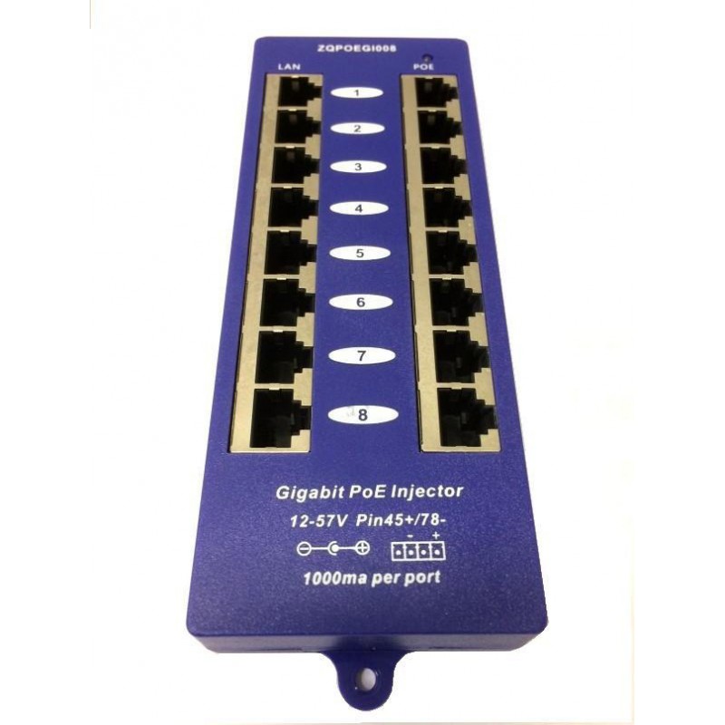 Panel integrující osm gigabitových pasivních POE injektorů s napájecím rozsahem 12-57V a max. proudem 1000mA/port.