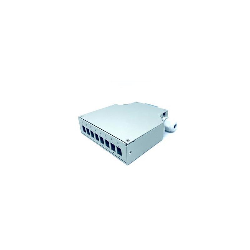 Optický rozvaděč/box pro umístnění na DIN lištu šedé barvy pro max. 8 SC simplex spojek, kovový se šroubovatelným víkem pro zakončení max. 12 optických vláken. Box má 4 kabelové vstupy a dodává se se 2 kabelovými průchodkami, držáky svárů neosazen spojkami.
