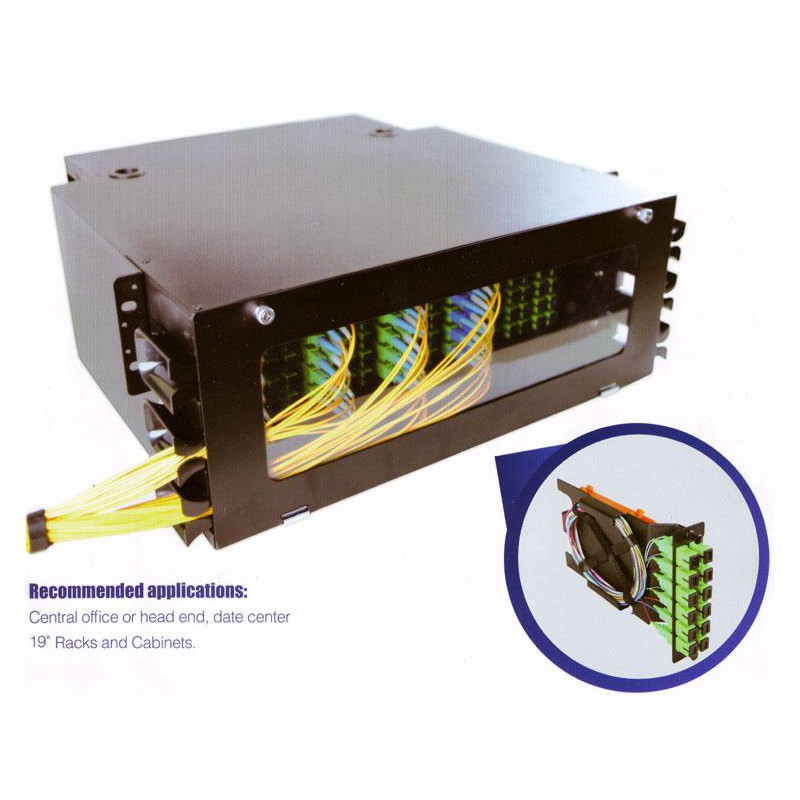 Optická vana 4U pro 144 spojek (až 288 vláken při použití LC komponentů) do datových center, kde je potřeba na malém místě ukončit desítky vláken.