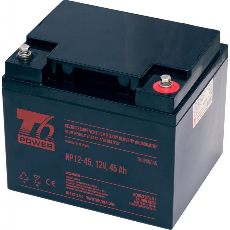 Akumulátor T6 Power NP12-45 je speciálně navržen pro zařízení s vysokou zátěží. Skvěle se hodí pro napájení UPS, elektromotorů, datových center, telekomunikačních zařízení, apod. Tento bezúdržbový ventilem řízený olověný akumulátor disponuje kontakty T14, M6.