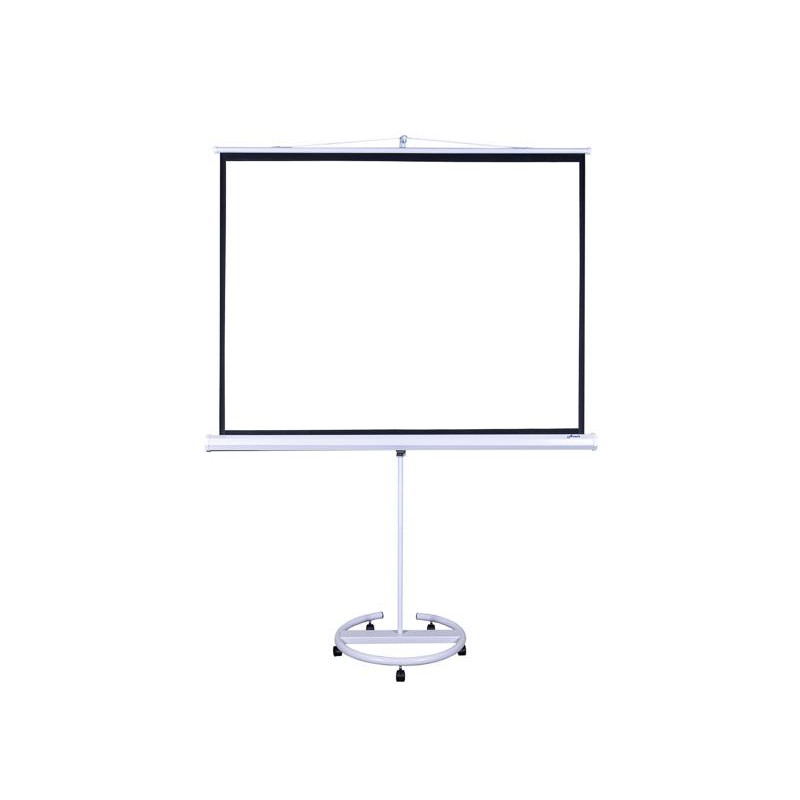 Mobilní stativové projekční plátno AVELI má stabilní základ s pěti kolečky. Plátno je matně bílé s černým orámováním s formátem 4:3.