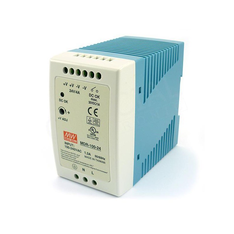 Profesionální spínaný napájecí zdroj Mean Well na DIN lištu s rozšířeným rozsahem provozních teplot s nastavitelným výstupním napětím 24V a výstupním výkonem 100W.