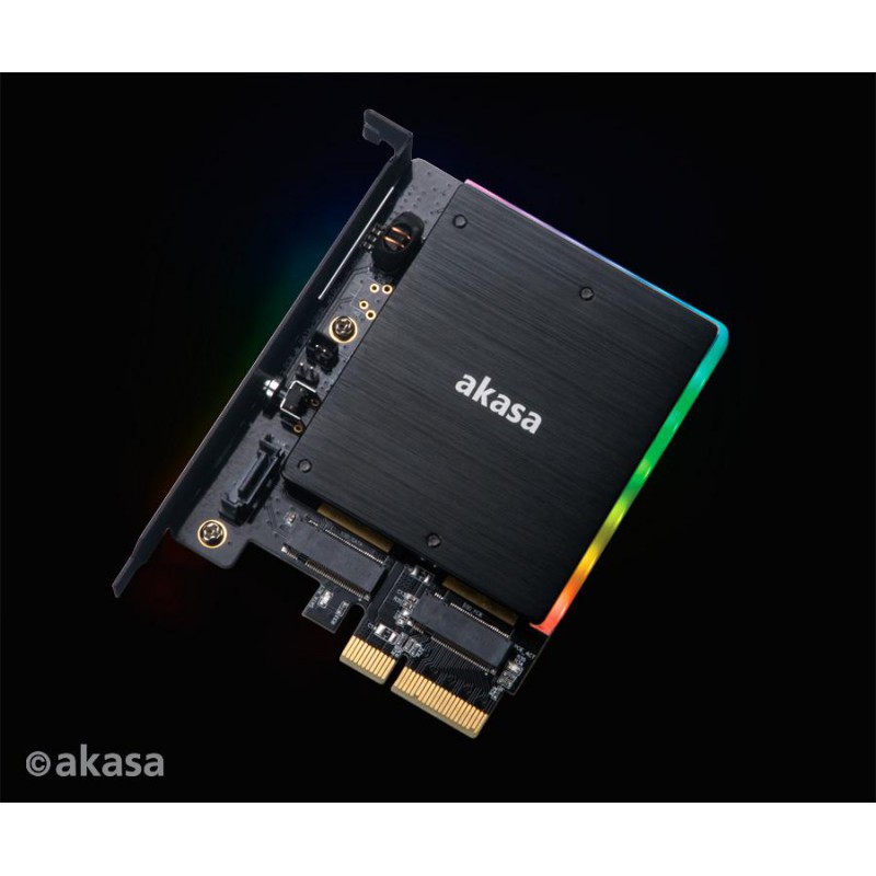Tento adaptér převádí dva disky M.2 PCIe SSD tak, aby fungovaly v hlavní desce sběrnice PCIe x4, snižuje teplo SSD, přidává digitální adresovatelnou barvu RGB