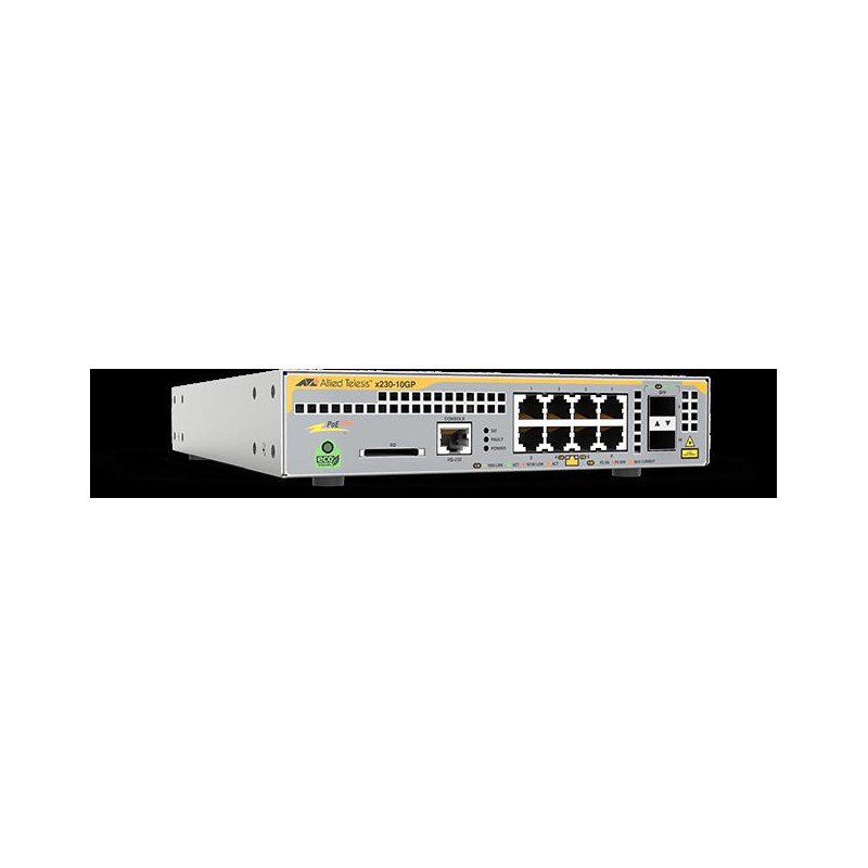 Allied Telesis x230-10GP má porty PoE+ x 10/100/1000T s 2 SFP Gigabitovými uplinkovými porty. Kompaktní konstrukce poskytuje flexibilní možnosti rozmístění a Power over Ethernet Plus (PoE+) poskytuje až 30 wattů pro podporu zařízení s vysokým výkonem , jako jsou vícebodové bezdrátové přístupové body a digitální bezpečnostní kamery.