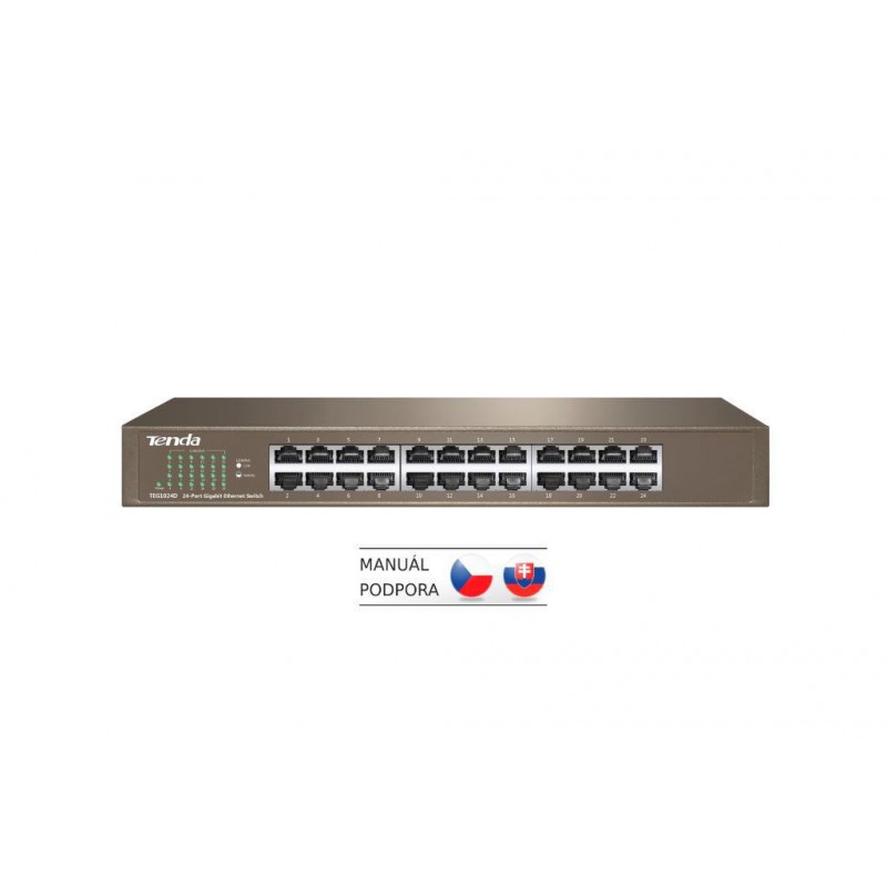Tenda TEG1024D je 24 portový gigabitový desktop/rackmount switch. Fanless - bez ventilátorů. Auto MDI/MDIX. Ochrana proti přepětí 6000 V. Propustnost 48 Gb/s. Kovové provedení. Desktop nebo montáž do rozvaděče. Součástí balení je český, slovenský a polský manuál.