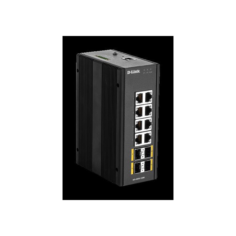 Průmyslový spravovatelný 12-portový Gigabit Ethernet switch, osazený 8 porty 10/100/1000M RJ-45 a 4x 100/1000 SFP sloty pro optický uplink. SFP sloty jsou dvourychlostní, podporují Gigabit SFP a 100M SFP transceivery. Správa přepínače je z webového rozhraní, pomocí SNMP nebo CLI příkazů (sériová konzole, Telnet).