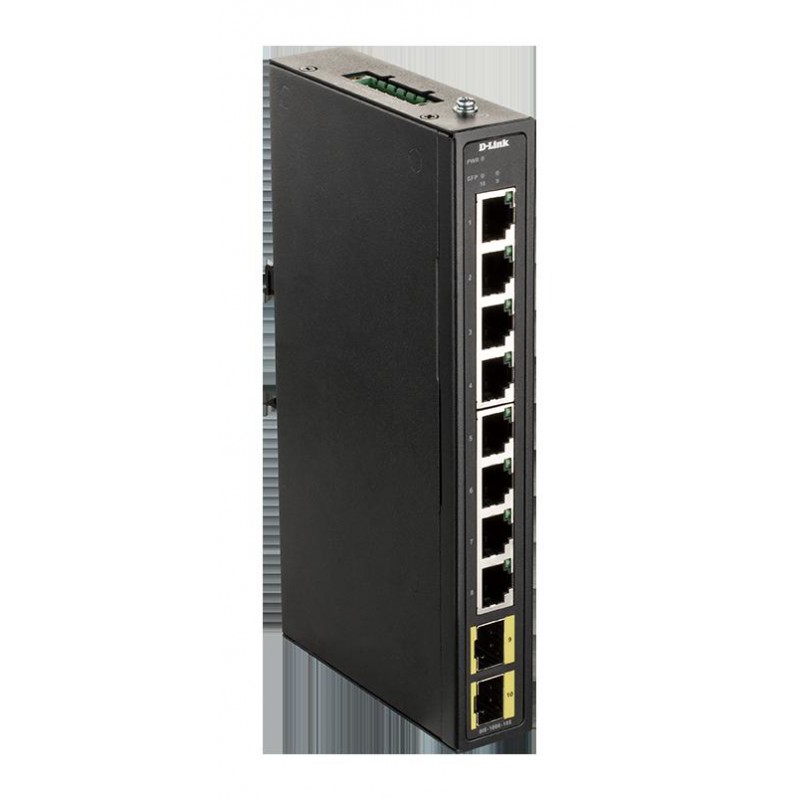 D-Link DIS-100G-10S je průmyslový 10-portový Gigabit Ethernet switch bez managementu, osazený 8 porty 10/100/1000M RJ-45 a dvěma Gigabit SFP sloty pro optický uplink. Přepínač je určen pro montáž na DIN lištu. Je v robustním kovovém provedení bez ventilátoru, se stupněm krytí IP40 a s rozšířeným rozsahem provozních teplot -20°C až +65°C. Pro napájení s možností redundance jsou k dispozici dvě svorkovnice 12V-48V DC, volitelně lze dokoupit 230V AC zdroj (např. D-Link DIS-H30-24). Switch je vhodný pro instalaci do klimaticky náročných prostředí, jako jsou průmyslové aplikace, automatizace, dopravní aplikace, kamerové systémy, internet věcí (Internet of Things, IoT), chytrá města (Smart Cities) apod.