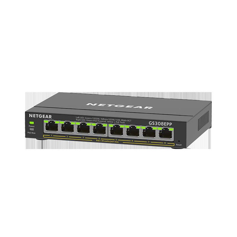 GS308EPP-100PES - 8-Portový Gigabit Ethernet PoE+ Plus Switch FUNKCE - Pokročilé ovládací prvky pro optimalizovaný výkon sítě a lepší poskytování kritického provozu, jako je hlas a video - Podpora VLAN pro segmentaci provozu - Zrcadlení portů pro monitorování sítě - Jednoduché nakonfigurování sítě pomocí uživatelsky přívětivého webového grafického rozhraní NETGEAR Smart Managed TECHNICKÉ VLASTNOSTI 10/100/1000 RJ45 měděné porty (Auto Uplink) : 8x Typ konektoru: Kov PoE porty: 8x Nepřerušovaný PoE: Ano Šířka pásma: 16Gbps Max. počet MAC záznamů: 4K Velikost vyrovnávací paměti: 192KB Přednostní řazení do fronty: WRR Jumbo frame: 9 216 bytů MTBF: 842 428 hodin VLAN: 64 Agregace odkazů / propojení portů: Ano IGMP snooping (v1, v2, and v3): Ano Blokovat neznámé vícesměrové vysílání: Ano DHCP klient: Ano Podporované skupiny vícesměrového vysílání: 128 PoE porty: 4x LED: Rychlost, Odkaz, Aktivita, PoE Rozměry (Š x H x V): 158 x 101 x 27 mm Hmotnost: 0,49kg Operační teplota: 0°až 40°C Certifikace: CE, VCCI, ACMA, CSA, KC, BSMI OBSAH BALENÍ - NETGEAR Plus Switch - Napájecí adaptér- Gumové nohy- Sada pro montáž na zeď- Instalační příručka
