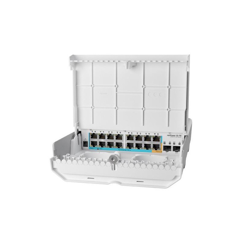 Venkovní 18 portový switch s 15 reverzními PoE in porty, jedním PoE out portem a dvěma SFP porty.