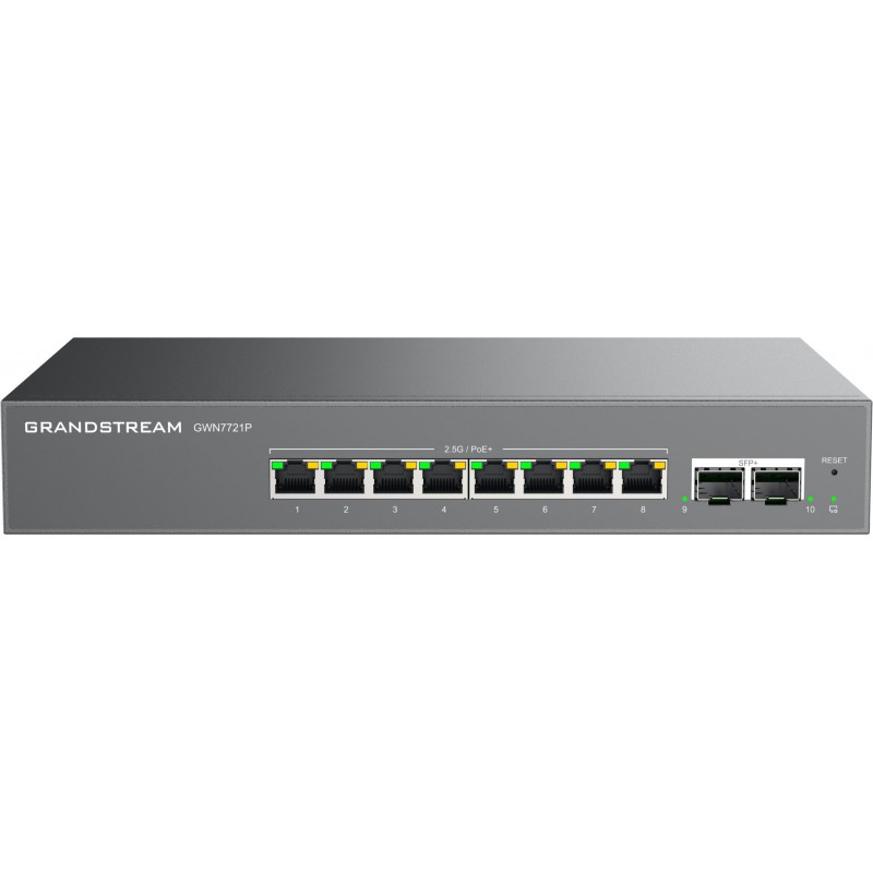 GWN7721P je 10portový managovatelný switch L2 Lite, vybavený 8x 2,5G ethernetovými porty a 2x 10gigabitovými SFP+ porty, vhodný pro malé a střední podniky pro budování škálovatelných, bezpečných a inteligentních sítí.