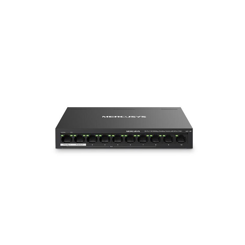 MS110P 10-Port 10/100Mbps Desktop Switch with 8-Port PoE+PORT: 8× 10/100 Mbps PoE+ Ports, 2× 10/100 Mbps Non-PoE PortsSPEC: Compatible with 802.3af/at PDs, 65 W PoE Power, Desktop Steel Case, Wall MountingFEATURE: Extend Mode for 250m PoE Transmitting, Priority Port1-2, Isolation Mode, PoE Auto Recovery, Plug and Play
