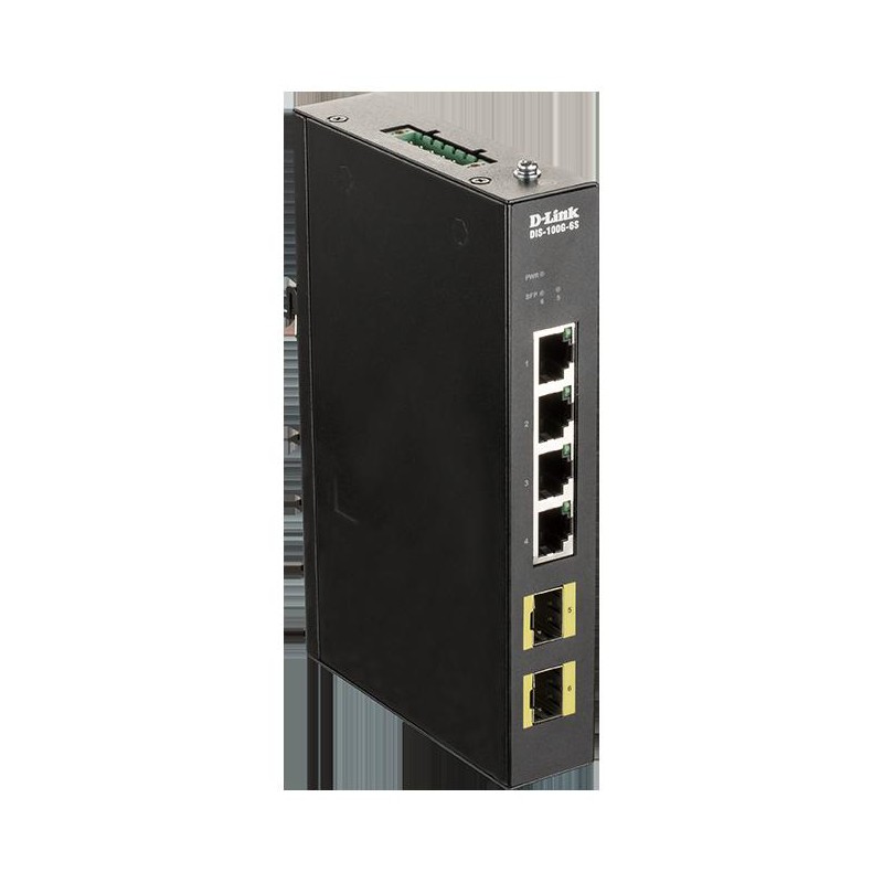D-Link DIS-100G-6S je průmyslový 6-portový Gigabit Ethernet switch bez managementu, osazený 4 porty 10/100/1000M RJ-45 a dvěma Gigabit SFP sloty pro optický uplink. Přepínač je určen pro montáž na DIN lištu. Je v robustním kovovém provedení bez ventilátoru, se stupněm krytí IP40 a s rozšířeným rozsahem provozních teplot -20°C až +65°C. Pro napájení s možností redundance jsou k dispozici dvě svorkovnice 12V-48V DC, volitelně lze dokoupit 230V AC zdroj (např. D-Link DIS-H30-24). Switch je vhodný pro instalaci do klimaticky náročných prostředí, jako jsou průmyslové aplikace, automatizace, dopravní aplikace, kamerové systémy, internet věcí (Internet of Things, IoT), chytrá města (Smart Cities) apod.