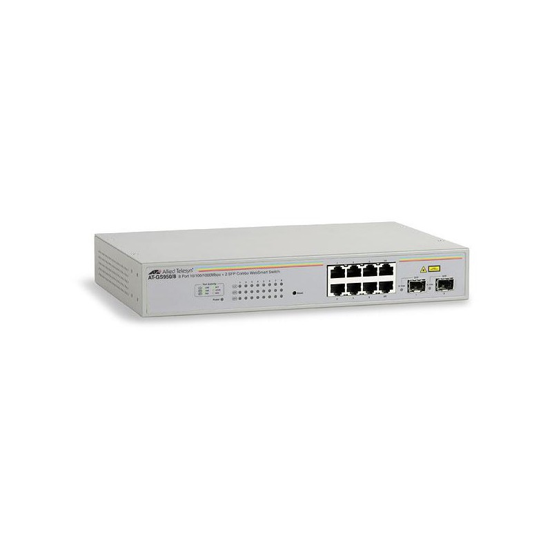 The WebSmart AT-GS950/8 features a Web-based interface that allows you to set up 802.1Q VLANs to segregate traffic, QoS to prioritize mission-critical data such as voice or video packets, and link aggregation to create traffic pipelines. The AT-GS950/8 also provides network monitoring tools such as port mirroring and basic port statistics. Remote product management enables simple monitoring from anywhere you have connectivity. This WebSmart switch provides managed features for simple QoS applications, 8 10/100/1000T ports and two combo SFP ports for Gigabit connections.