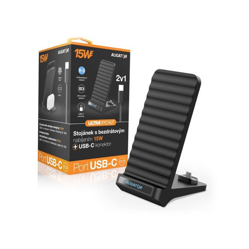 Aligator Stojánek s bezdrátovým nabíjením 15W a USB-C konektorem, 2v1, černý